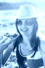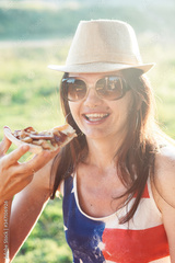 Beautiful middle aged woman bite a slice of pizza. Attractive woman eating pizza in sunset
