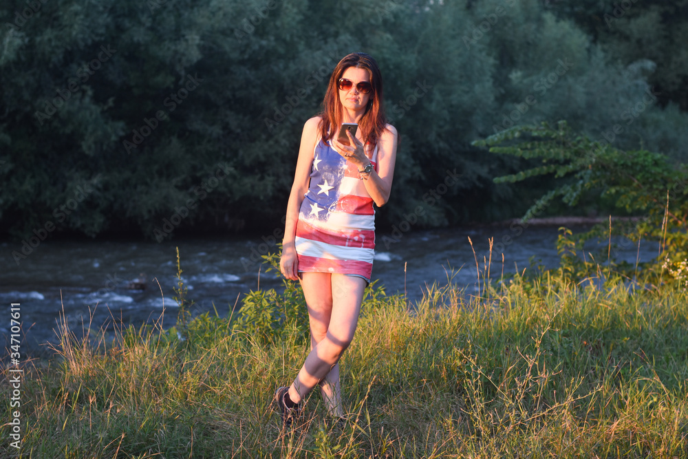 Middle aged woman speaking on phone outside . Beautiful woman speak on phone in sunset