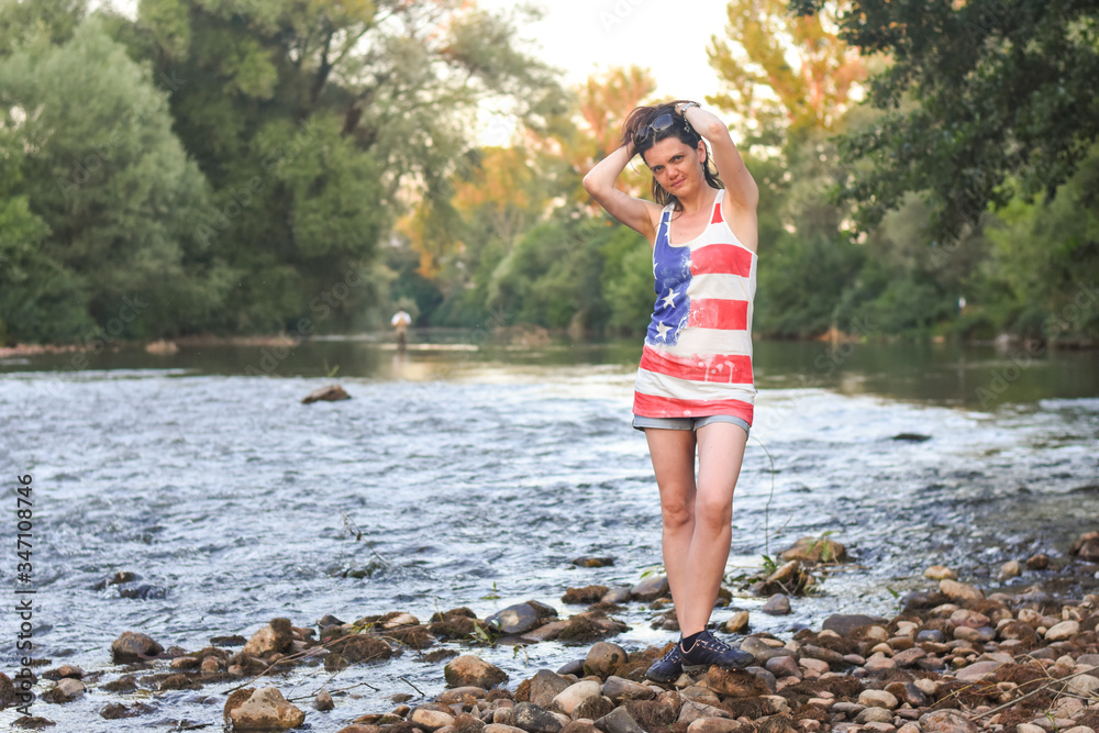 Beautiful middle aged woman on river coast. Older woman enjoy by the river at sunset