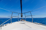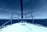 The front bow of a white sailing boat with blue sky and sea background. Love in blue with copy space