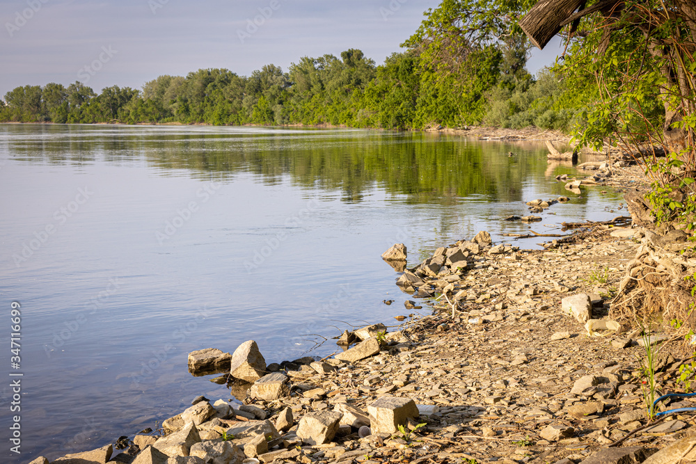 Sunset on the stone beach on Danube river with beautiful blue cloudy sky