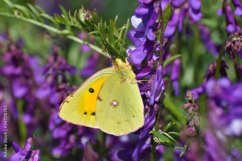 Pale clouded yellow butterfly. Colias hyale, the pale clouded yellow butterfly feeding on meadow