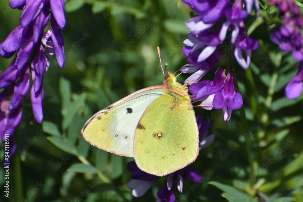 Pale clouded yellow butterfly. Colias hyale, the pale clouded yellow butterfly feeding on meadow