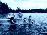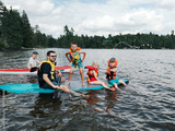 Fathers with kids swimming on paddle board on lake. Dads with children doing sport summer water activity outdoors. Seasonal recreation water entertainment. Sporty family friends.