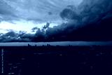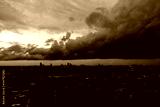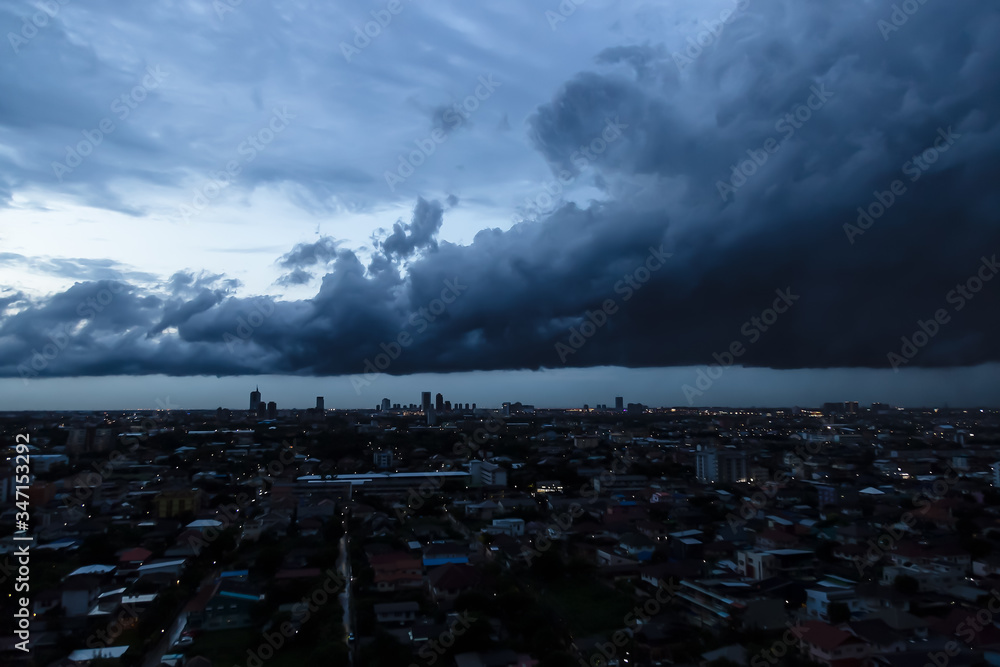 Dark dramatic sky at night time, it is monsoon with stormy gray clouds before raining. It is strong wind in the city. Large clouds over city. It is heavy cloud and raining some city. aerial view