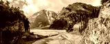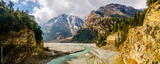 Panoramic view of the Kali Gandaki valley between Larjung and Kokhethanti villages in cloudy winter day. Annapurna circuit / Jomsom trek, Nepal.