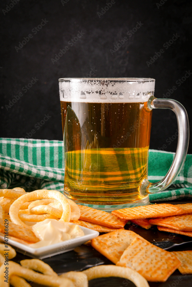 beer with onion rings, cracker, sauce, on a dark background, checkered green towel