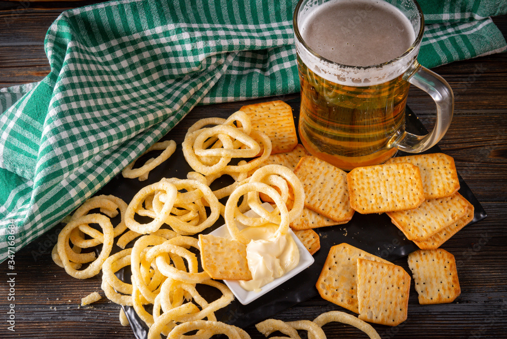 glass of light beer with appetizer, cracker, onion rings and sauce, checkered green towel on a dark