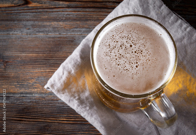 alcoholic beverage , light barley beer on a dark wooden , top view,