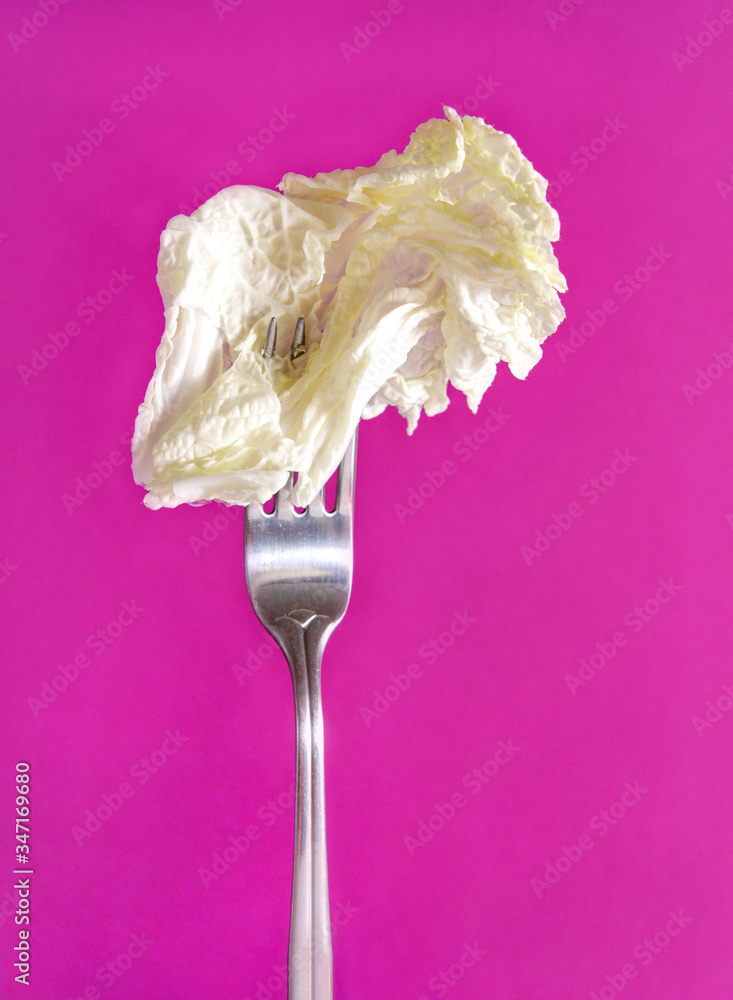 light lettuce leaf on a fork on a violet background