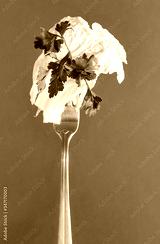 sprig of fresh lettuce , green parsley on a fork on a lilac background