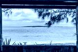 View of Coco Plum beach through the window of a small wooden house (Great Exuma, Bahamas).