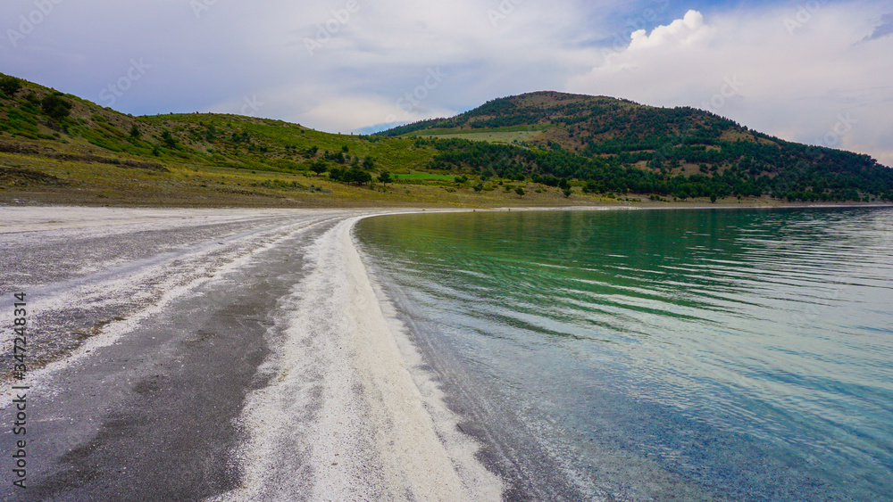 The coast of Salda Lake (Salda Golu), Burdur, Turkey. The breathtaking lake landscape under cloudy sky. White sand and amazing blue unique lake on a cloudy day. Laptop wallpaper picture. Lake in Asia.