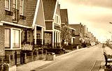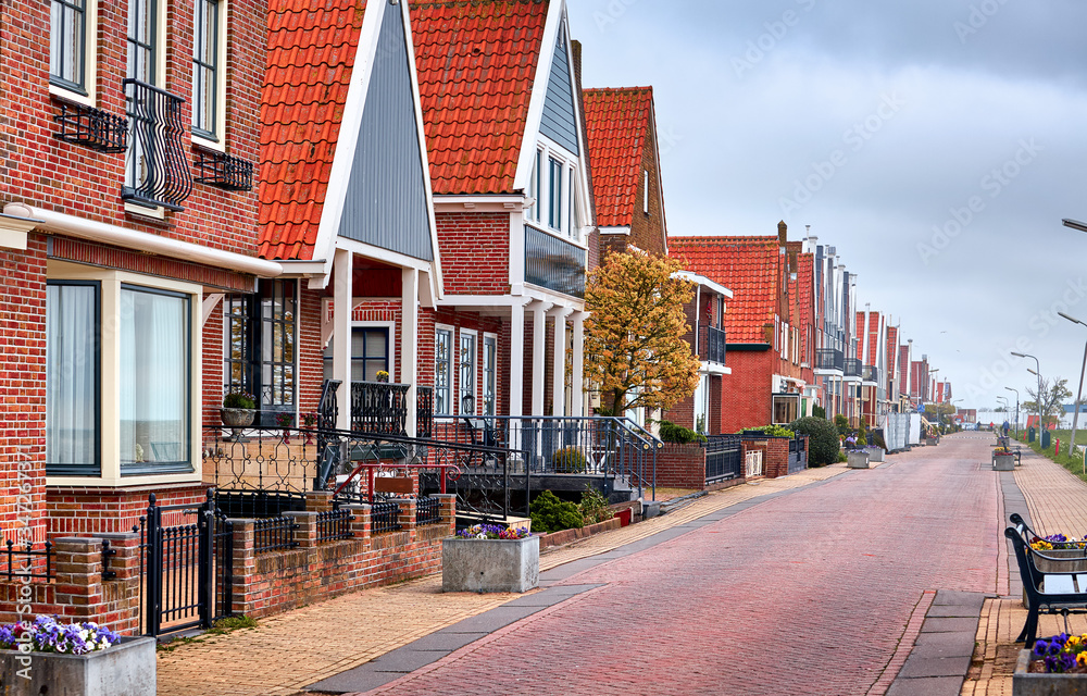 Fishing village Volendam panoramic view Holland Netherlands. Small wooden houses blue sky clouds.