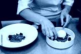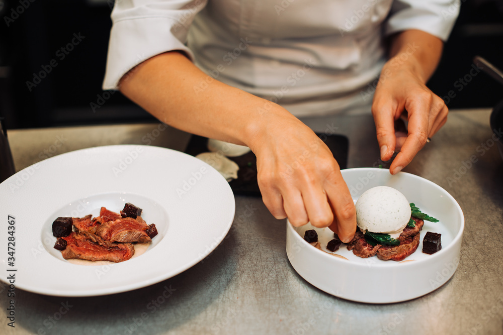 Michelin chef serving food for guests in the kitchen, french cuisine, close up, crop on hands