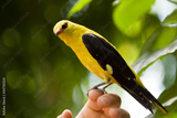 Golden oriole sitting on a hand
