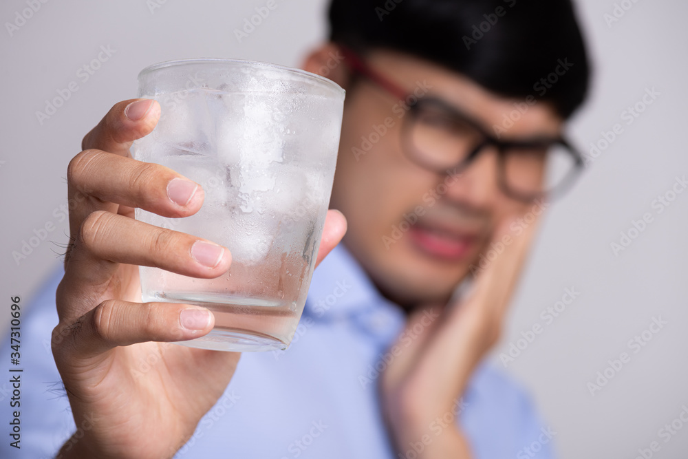 Young man with sensitive teeth and hand holding glass of cold water with ice. Healthcare concept.