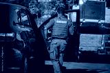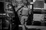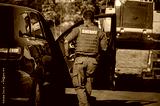Behind view of police officer in bullut proof vest looking into passanger side of car at the scene of an accident