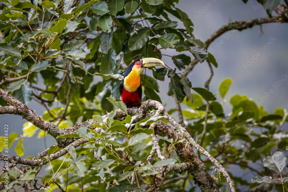 Close up of a beautiful Red-breasted toucan, perched on a tree branch, background green leaves, Itatiaia, Minas Gerais, Brazil