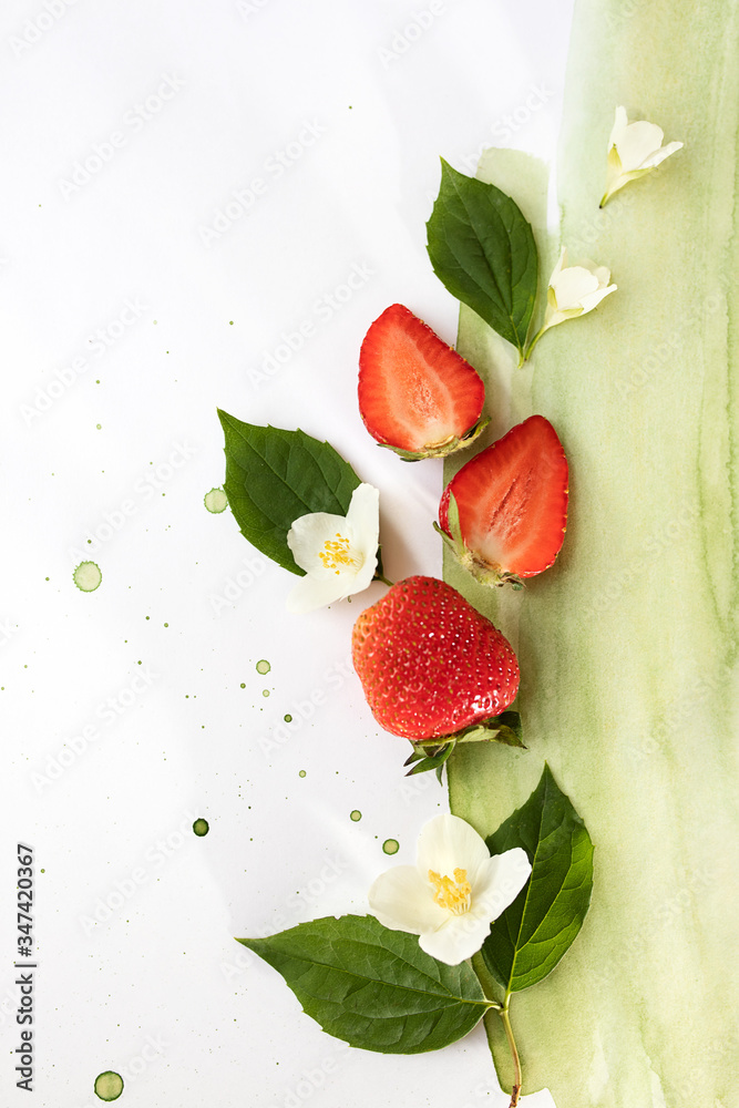 The creative composition is made of bright strawberries on a two-color watercolor background. Flat lay. The concept of food. Copy space.