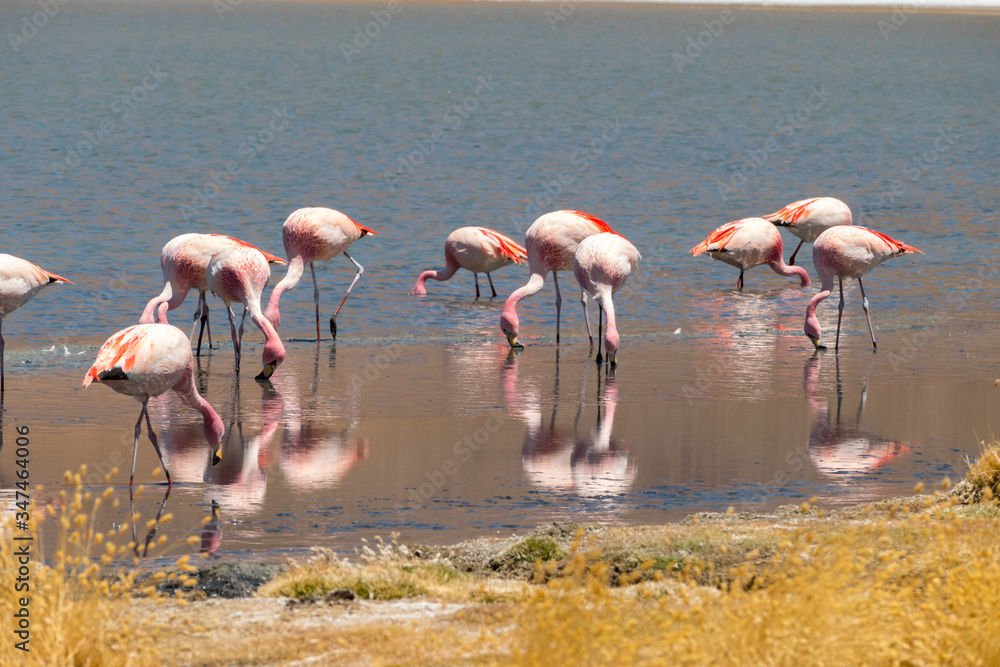 Pink flamingos at Canapa Lagoon, in Bolivia