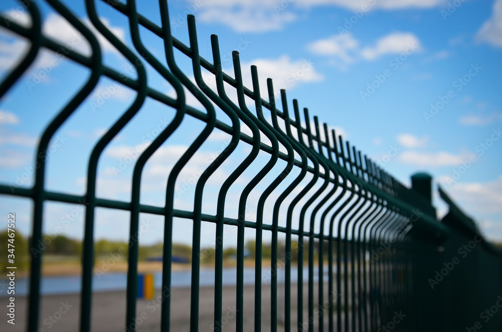 Green fence close-up on the background of the beach, river. Metal fence against the sky with white clouds. Concept: private property, fenced territory, prohibition.