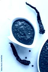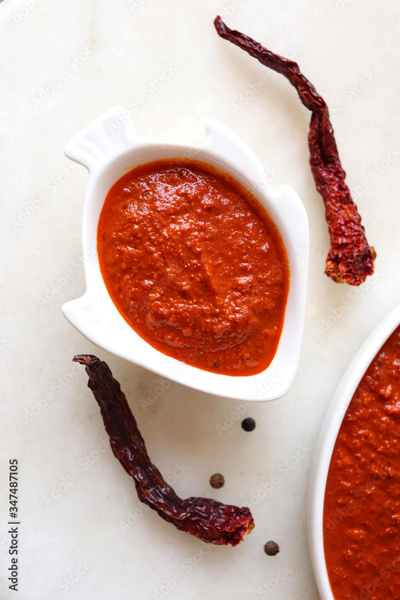 Indian Food- Goan fish curry paste or basic red coconut fish curry masala. served in the fish shaped bowl. Ingredients at background with copy space.