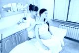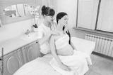 Beautiful pregnant brunette woman with long hair enjoys a massage of the shoulders and sternum in a cosmetology room