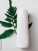 Cosmetic bottle containers with green herbal leaves, Blank label for branding mock-up, Natural beauty product concept.