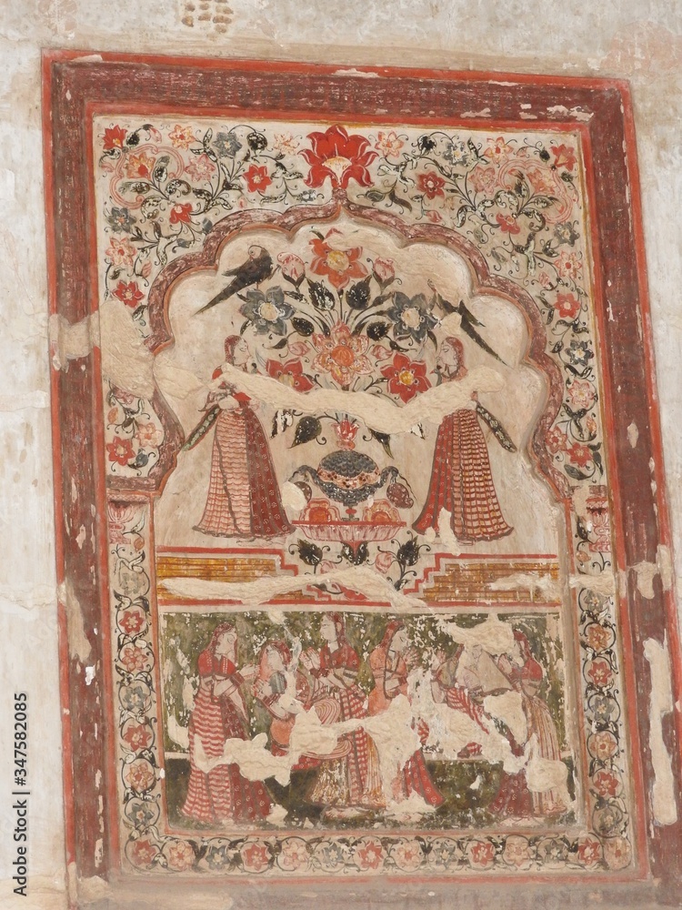 Wall paintings of Orchha Fort and Palace, Madhya Pradesh, India.