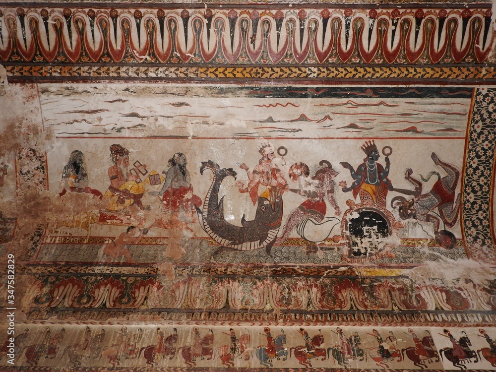 Wall paintings of Orchha Fort and Palace, Madhya Pradesh, India.