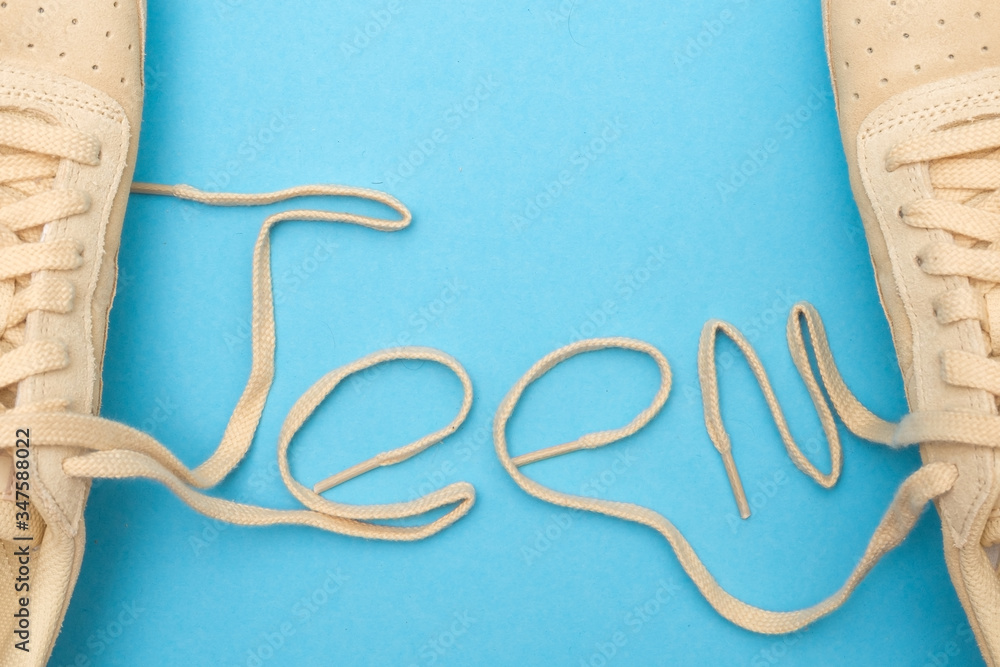 Pair of fashionable sneakers and laces in teen word on blue wall.