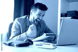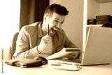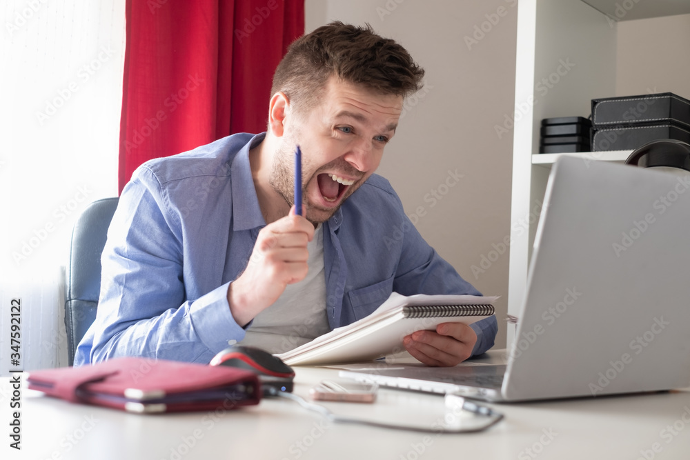 young caucasian man working on laptop being excited with results of his strat up.