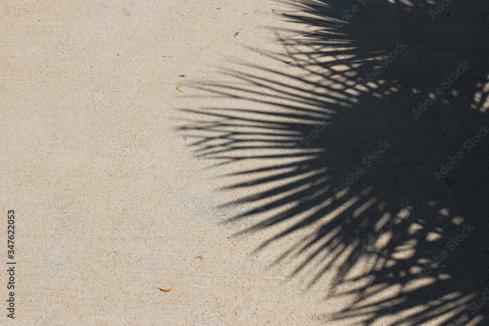 Palm leaves shadows on beige concrete rough textured background. Dark silhouette of the exotic leaves in bright sunlight. Summer vacation concept. Flat lay, top view. Empty copy space.