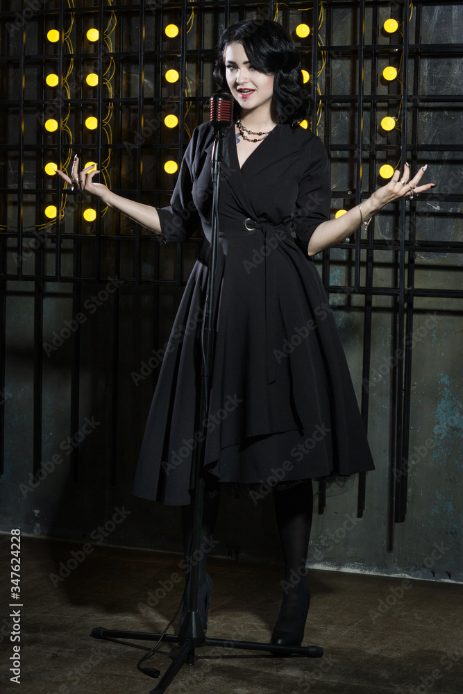 Gorgeous vintage 1950s lady with microphone in a black dress....