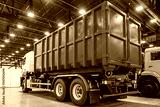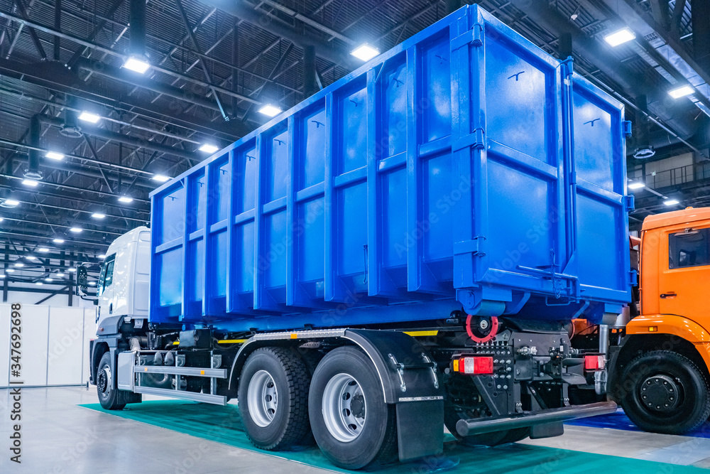 Equipment for public utilities. Truck for the removal of large-sized garbage. Municipal economy. The trash bin is mounted on the truck. Removal of construction debris.
