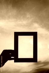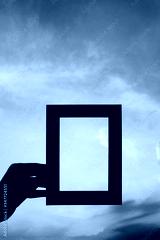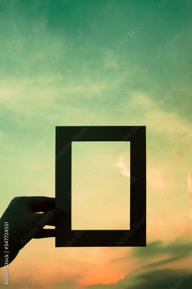 black silhouette hand holding picture frame in dramatic blue green sunset sky nature background