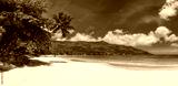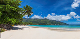 Panoramic view of amazing Beau Vallon beach with white sand and coconut palm tree on Mahe island, Seychelles.