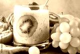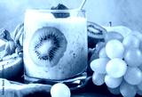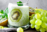 natural yoghurt with fresh kiwi, grapes, spinach and mint on a grey