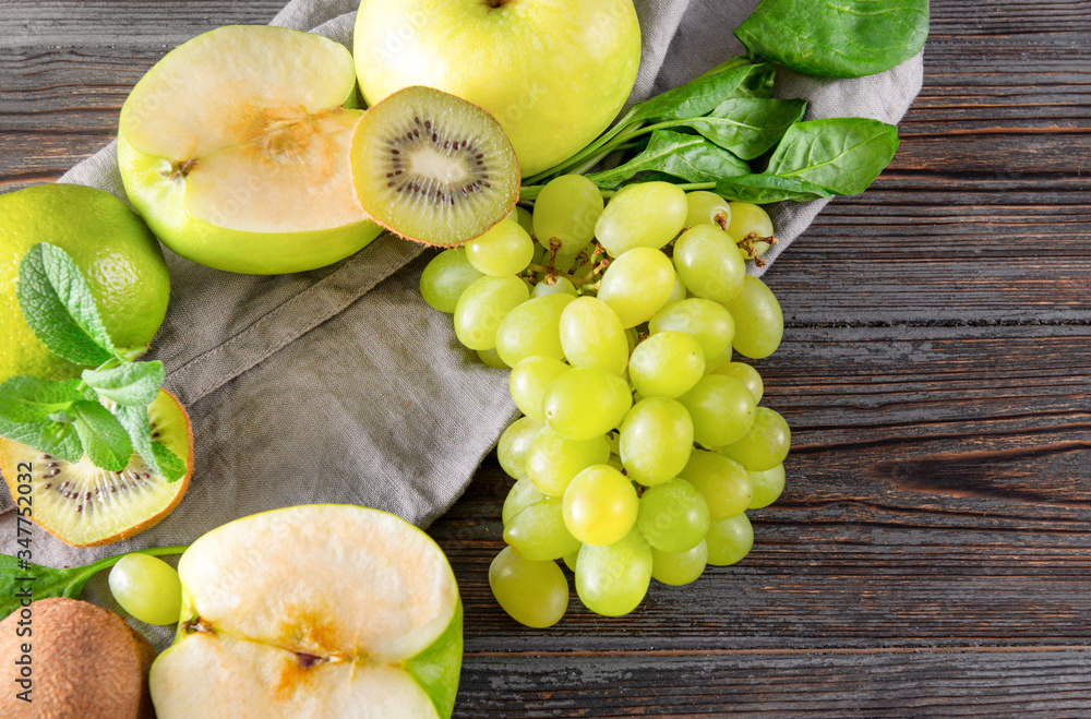 fruit, Apple halves, kiwi, grape berries, spinach leaves, mint sprigs on a gray napkin on a brown wooden background top view