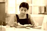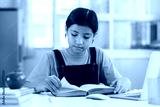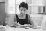 Asian girl reading and doing homework at her home