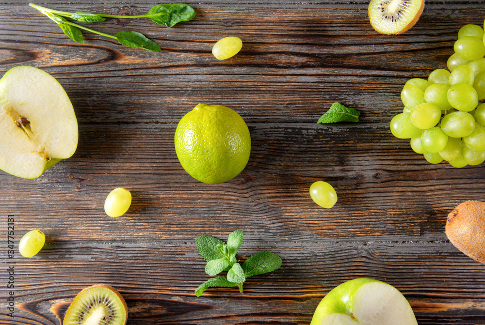 fresh fruit, Apple halves, kiwi, grape berries, spinach leaves, mint sprigs on a brown wooden