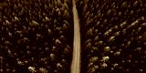 Top view of dark green forest landscape wallpaper art. Aerial nature scene of pine trees and asphalt road banner design. Countryside path trough coniferous wood form above.