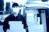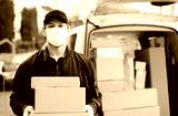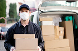Delivery man courier with face mask delivering parcel boxes in town.