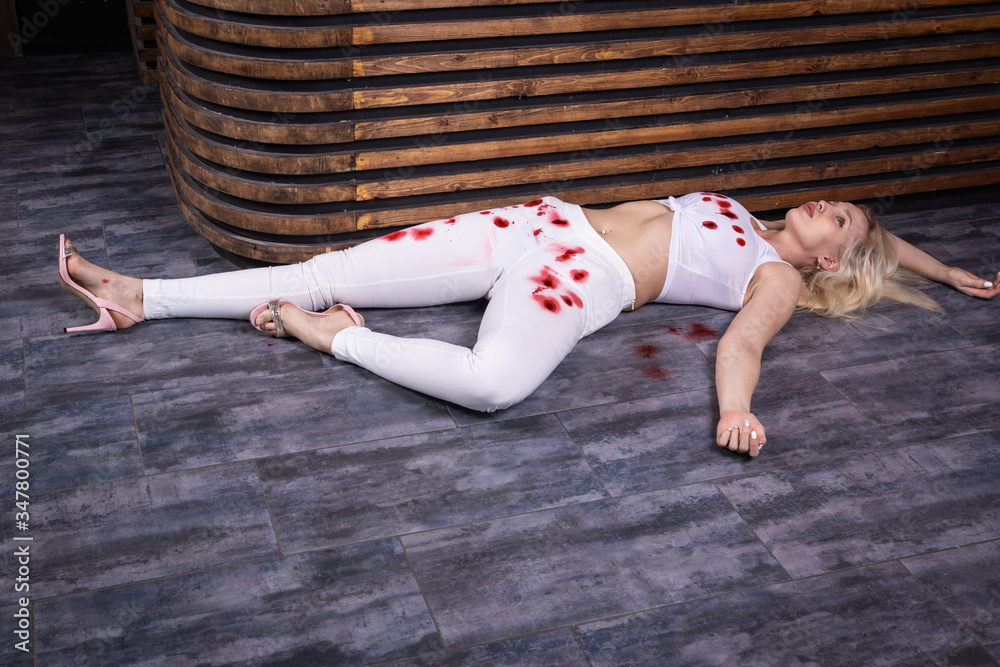 Crime scene (imitation). Pretty woman lying on the floor. She shot in the chest.