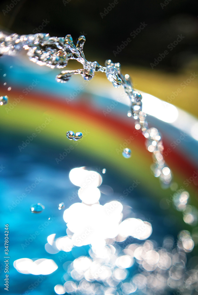 Flying stream of water with drops in a frozen state on the background of a blue pool with rainbow colors