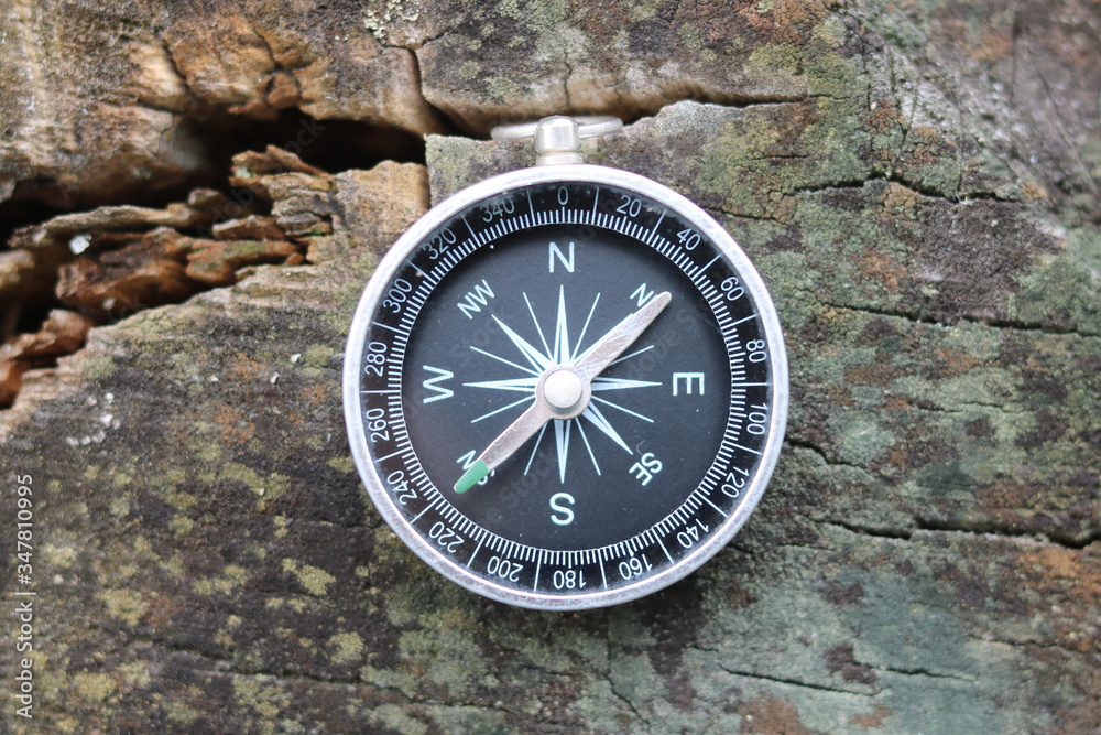 Old compass on natural wooden background