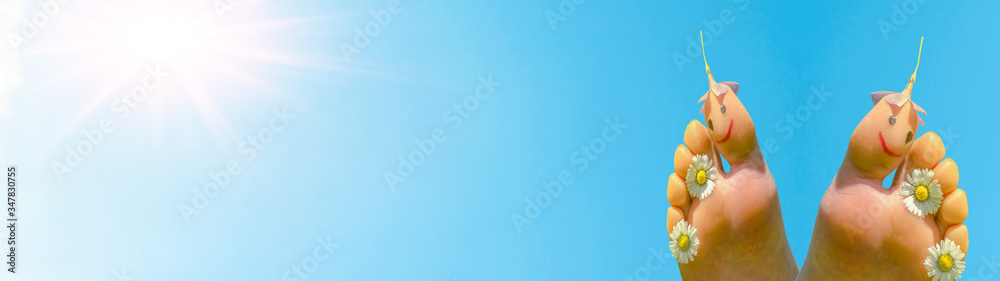 Hello summer background banner panorama - bare children's feet with flowers and smileys isolated on blue sky with sunshine and copy space