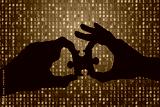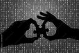 Silhouette of a hands holding a jigsaw puzzle piece with binary background