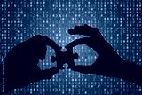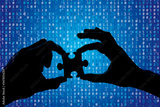 Silhouette of a hands holding a jigsaw puzzle piece with binary background